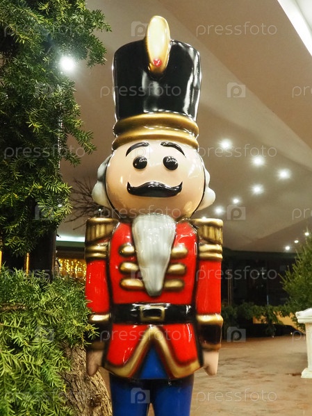 Щелкунчик в праздничном новогоднем рождественском стиле. Деревянная игрушка из красного золота. Щелкунчик Рождественский солдатик. Либретто сказочного балета «История Щелкунчика». Открытый дизайн. Большая фигура мужчины