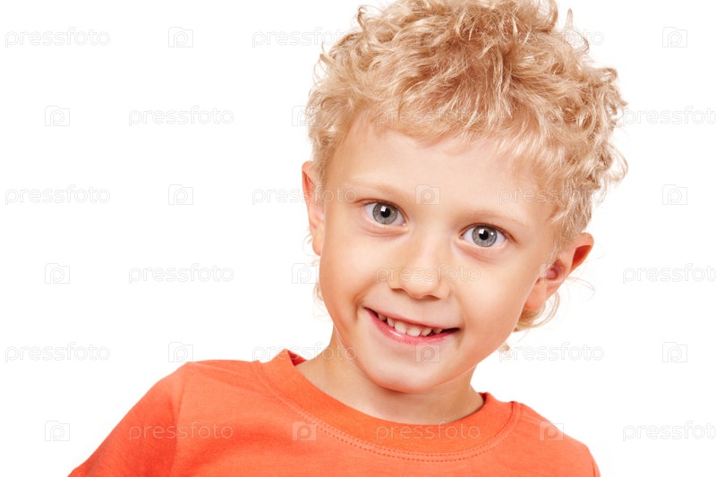 Портрет улыбающегося мальчика, смотрящего в камеру на белом фоне