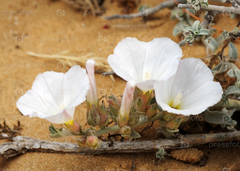 Белые цветы вьюнка, растущие на песке в Израиле