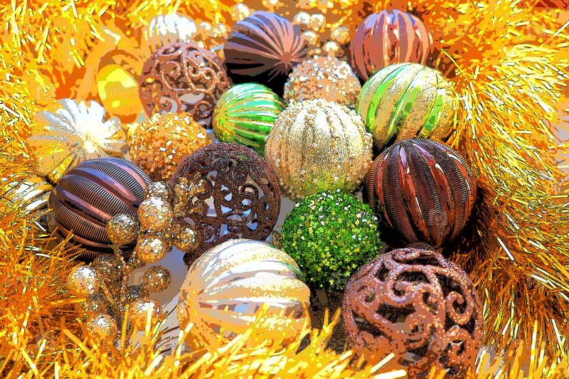 Новогодние елочные шары, мишура и украшения крупным планом. Много украшений золотого, коричневого, желтого, зеленого цвета. Полосатые елочные шары. Праздничный красивый красочный фон. Дизайн домашнего праздника