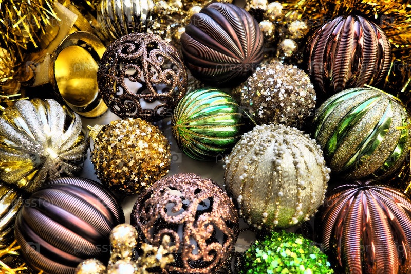 Новогодние елочные шары, мишура и украшения крупным планом. Много украшений золотого, коричневого, желтого, зеленого цвета. Полосатые елочные шары. Праздничный красивый красочный фон. Дизайн домашнего праздника