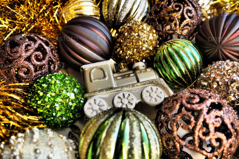 Новогодние елочные шары, мишура и украшения крупным планом. Много украшений золотого, коричневого, желтого, зеленого цвета. Полосатые елочные шары. Праздничный красивый красочный фон. Дизайн домашнего праздника