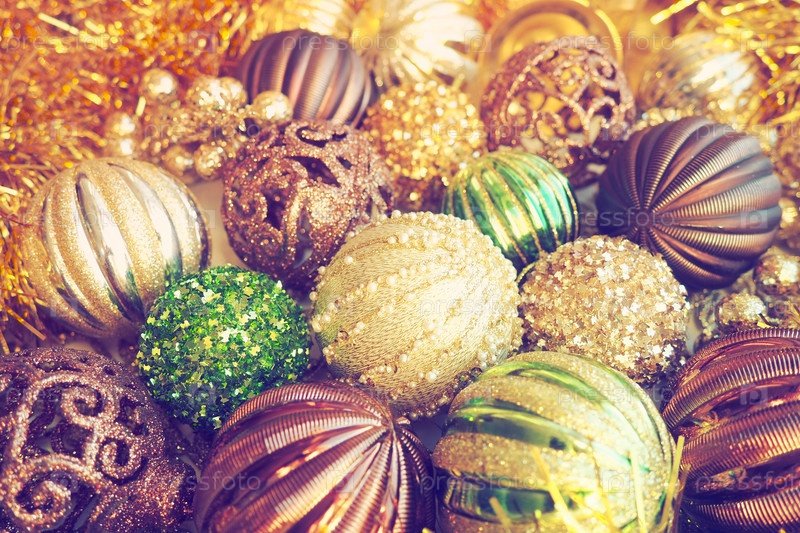Новогодние елочные шары, мишура и украшения крупным планом. Много украшений золотого, коричневого, желтого, зеленого цвета. Полосатые елочные шары. Праздничный красивый красочный фон. Дизайн домашнего праздника