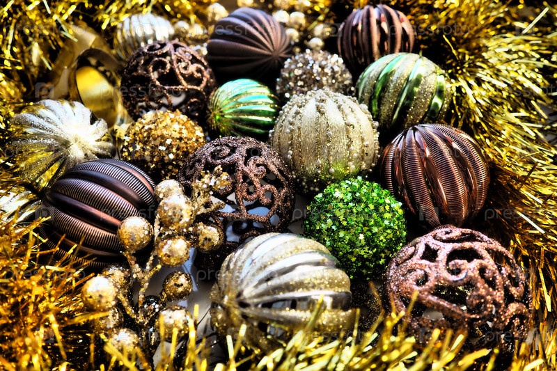 Новогодние елочные шары, мишура и украшения крупным планом. Много украшений золотого, коричневого, желтого, зеленого цвета. Полосатые елочные шары. Праздничный красивый красочный фон. Дизайн домашнего праздника