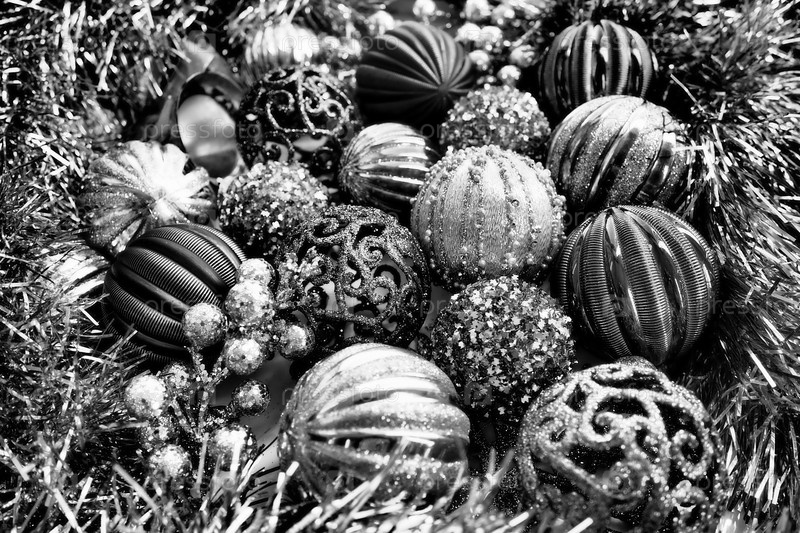 Новогодние елочные шары и украшения закрывают поверхность. Монохромный черный белый серебристый. Полосатые современные елочные шары. Праздничный красивый фон. Рождественская мишура. Украшаем дом к зимним праздникам