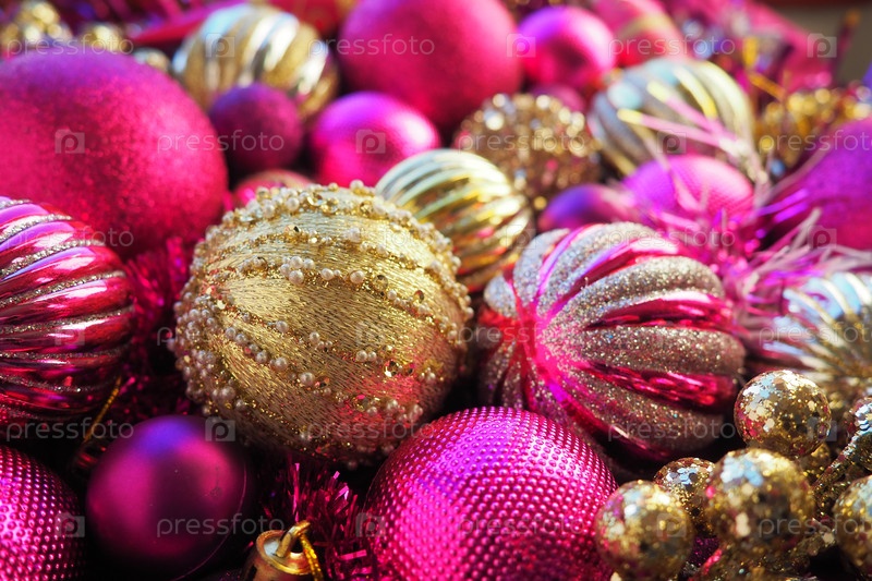 Новогодние елочные шары, мишура и украшения крупным планом. Украшения золотистого, розового, сиреневого, фиолетового, фиолетового цвета. Полосатые елочные шары. Праздничный красивый красочный фон. Дизайн домашнего праздника