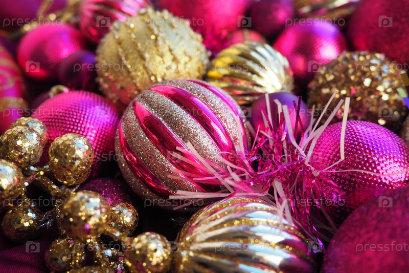Новогодние елочные шары, мишура и украшения крупным планом. Украшения золотистого, розового, сиреневого, фиолетового, фиолетового цвета. Полосатые елочные шары. Праздничный красивый красочный фон. Дизайн домашнего праздника