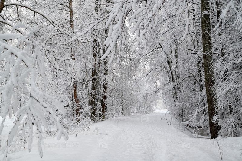 Снежная тропинка среди заснеженных деревьев в зимнем лесу