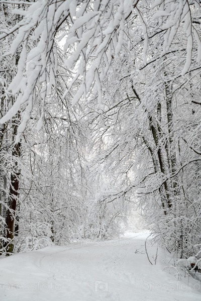 Снежная тропинка среди заснеженных деревьев в зимнем лесу