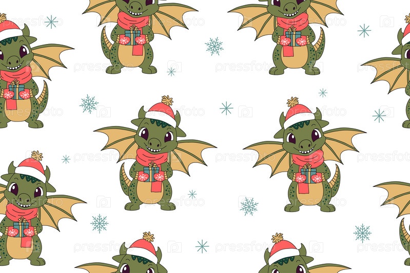 Бесшовный узор из милых драконов — символ 2024 года. Забавный зеленый дракон с подарком. Векторная иллюстрация