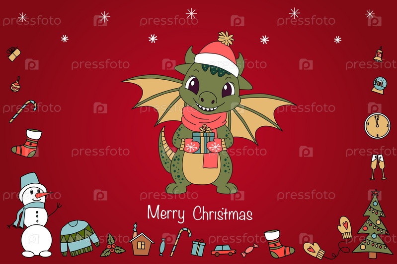 Рождественская открытка с милым зеленым драконом-символом 2024 года. Забавный зеленый дракон с подарком. Открытка с Рождеством и Новым годом. Вектор. Векторная иллюстрация