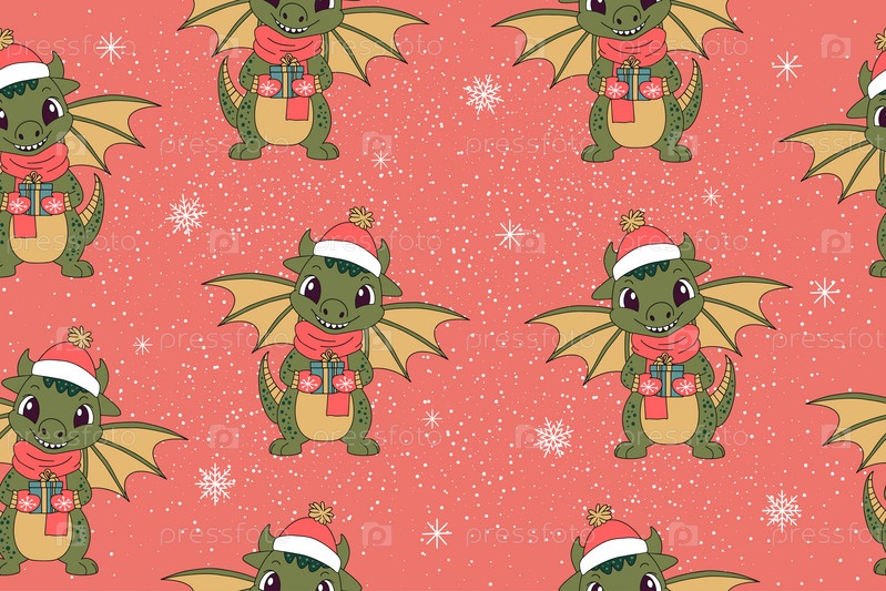 Бесшовный узор из милых драконов — символ 2024 года. Забавный зеленый дракон с подарком. Векторная иллюстрация