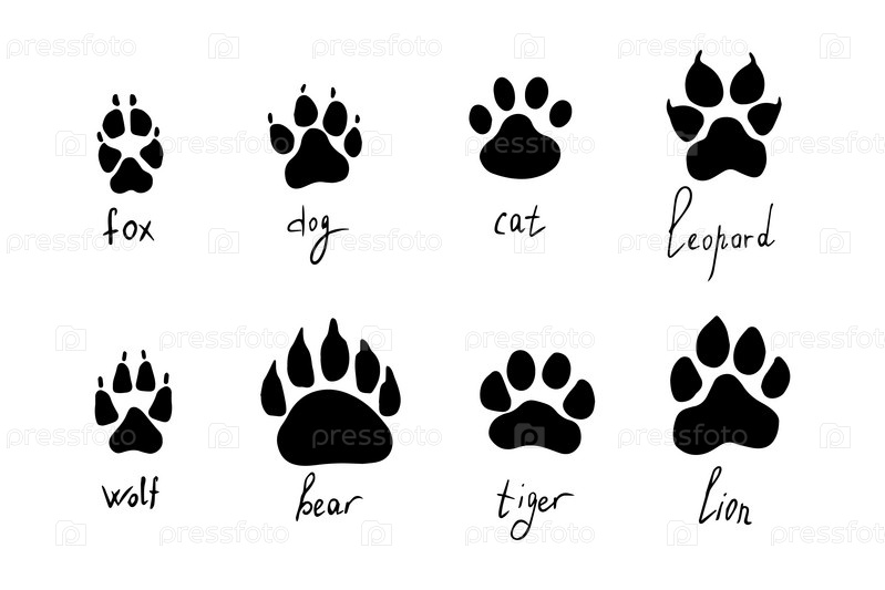 Набор отпечатков лап животных, векторные следы различных животных. Собака лиса волк медведь кошка лев леопард тигр