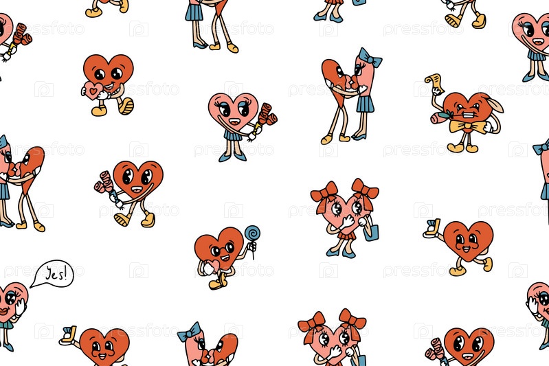 Бесшовный узор ко Дню святого Валентина с элементами заводного стиля. Векторный узор в стиле ретро 70-х, 80-х годов. Симпатичные сердечные персонажи. Векторная иллюстрация