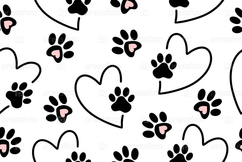 Бесшовный рисунок лапы домашнего животного в сердце. След домашнего животного. Концепция любви