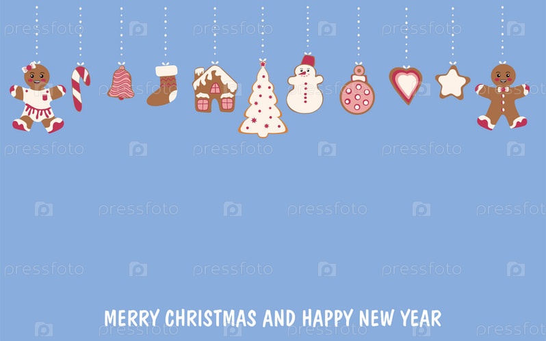Веселая рождественская открытка. Пряники в виде снеговика, елочки и пряничных человечков и различные елочные игрушки. Празднование Нового года и Рождества