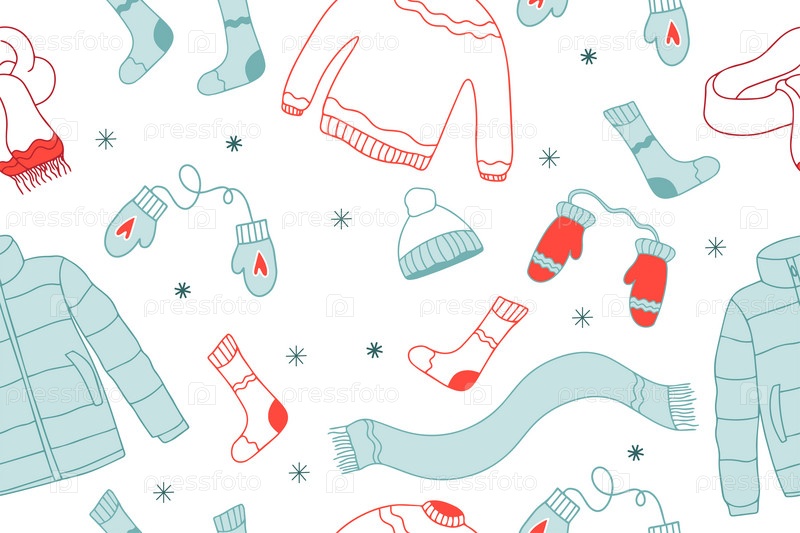 Бесшовный узор с теплыми элементами. Шарф, шапка, варежка. Ручной рисунок. Векторная иллюстрация