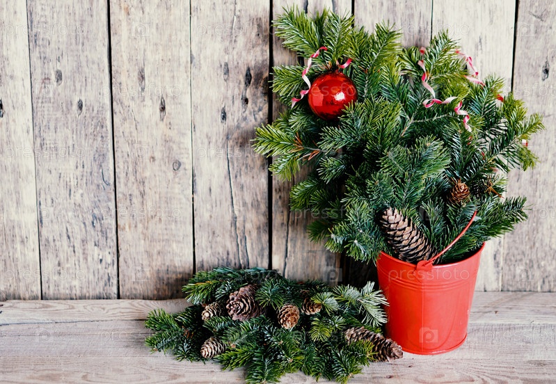 Маленькое красное ведро с зелеными еловыми ветками и елочным игрушечным мячом на деревянном фоне. Приветствую Рождество или Новый год