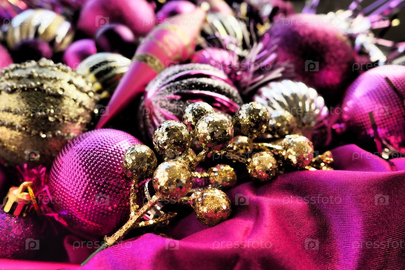 Новогодние елочные шары, мишура и украшения крупным планом. Украшения золотистого, розового, сиреневого, фиолетового, фиолетового цвета. Полосатые елочные шары. Праздничный красивый красочный фон. Дизайн домашнего праздника