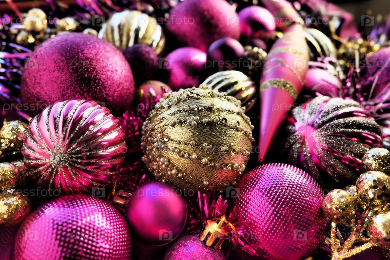 Новогодние елочные шары, мишура и украшения крупным планом. Украшения золотистого, розового, сиреневого, фиолетового, фиолетового цвета. Полосатые елочные шары. Праздничный красивый красочный фон. Дизайн домашнего праздника