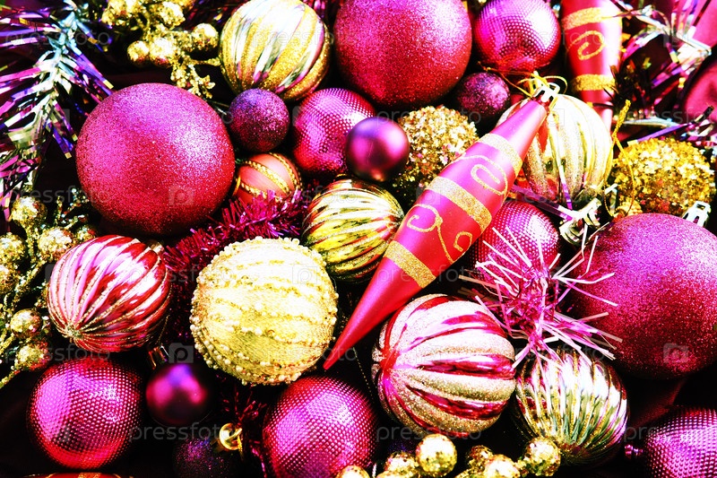 Новогодние елочные шары, мишура и украшения крупным планом. Украшения золотистого, розового, сиреневого, фиолетового, фиолетового цвета. Полосатые елочные шары. Праздничный красивый красочный фон. Дизайн домашнего праздника