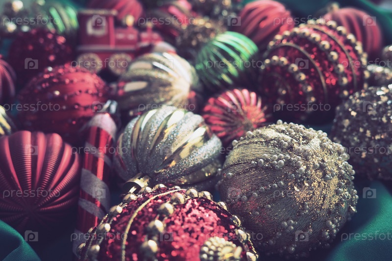 Новогодние елочные шары, мишура и украшения крупным планом. Много украшений золотого, красного, желтого, зеленого цвета. Полосатые елочные шары. Праздничный красивый красочный фон. Дизайн домашнего праздника