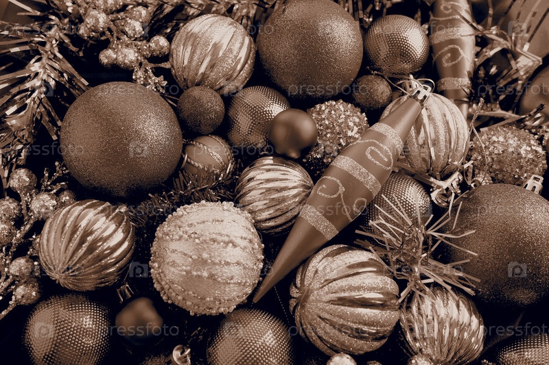 Новогодние елочные шары и украшения крупным планом. Много декора. Полосатые елочные шары лежат кучей. Праздничный красивый красочный фон. Дизайн. Сепия
