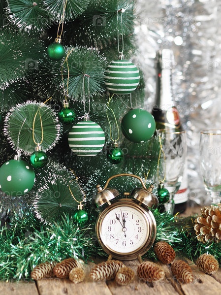 Открытка на Рождество и Новый год. Ретро-будильник и бутылка шампанского с бокалами накануне Рождества возле декоративной елки, нарядной в зеленом стиле