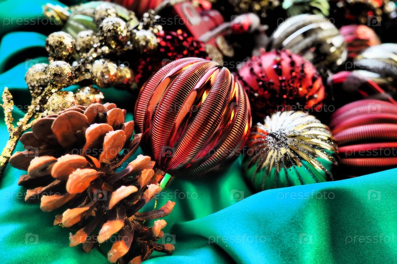 Новогодние елочные шары, мишура и украшения крупным планом. Много украшений золотого, красного, желтого, зеленого цвета. Полосатые елочные шары. Праздничный красивый красочный фон. Дизайн домашнего праздника