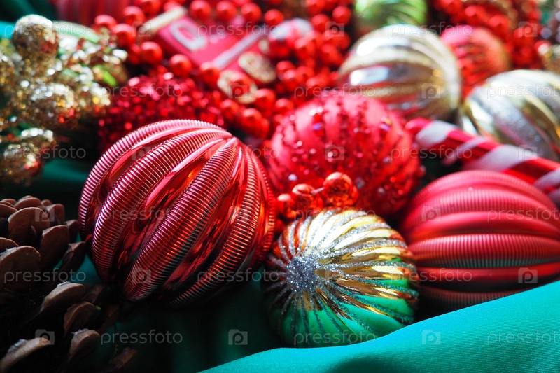 Новогодние елочные шары, мишура и украшения крупным планом. Много украшений золотого, красного, желтого, зеленого цвета. Полосатые елочные шары. Праздничный красивый красочный фон. Дизайн домашнего праздника