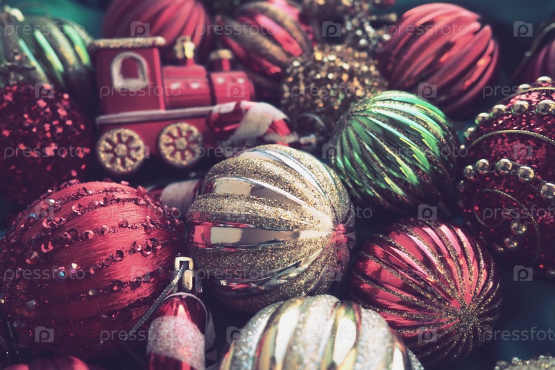 Новогодние елочные шары, мишура и украшения крупным планом. Много украшений золотого, красного, желтого, зеленого цвета. Полосатые елочные шары. Праздничный красивый красочный фон. Дизайн домашнего праздника
