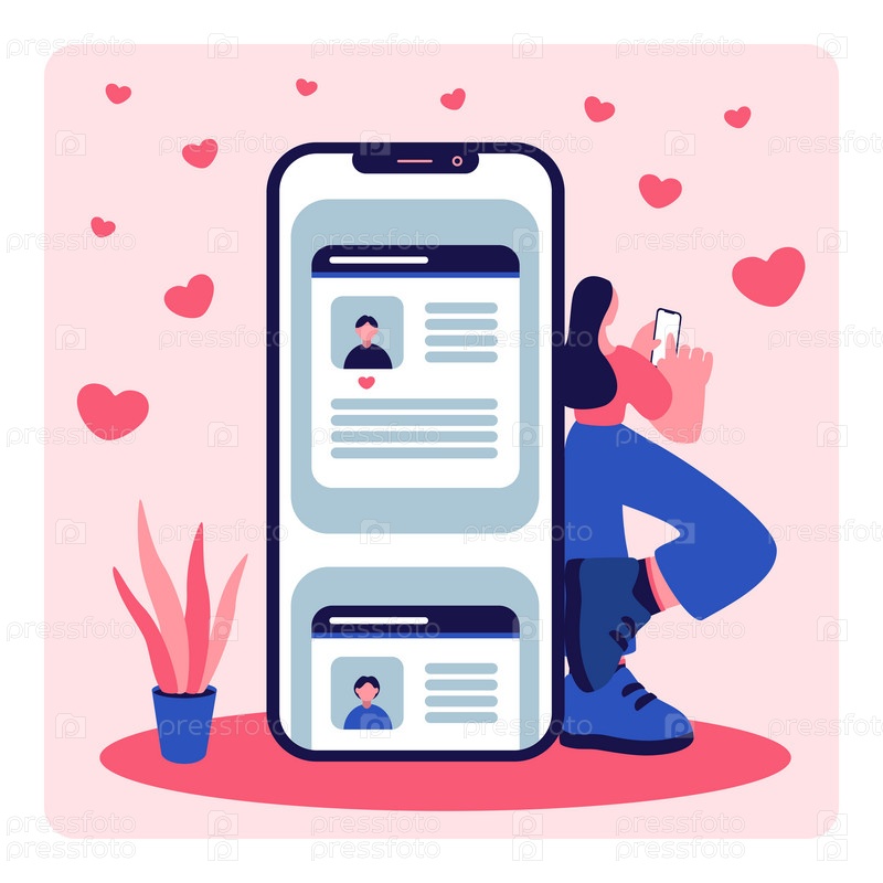 Девушка знакомится в приложении на своем телефоне, нравится парням векторная иллюстрация