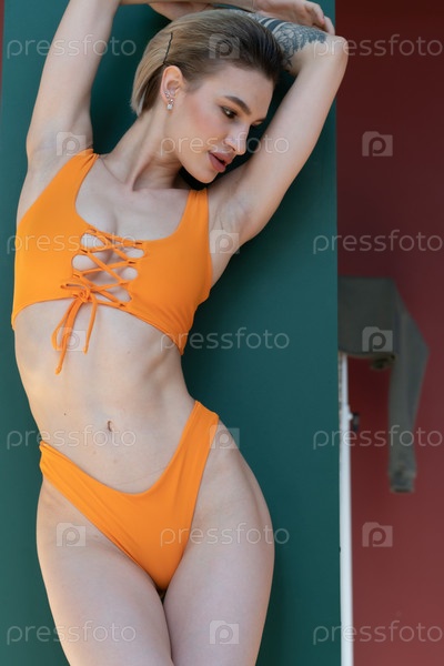 Молодая красивая женщина позирует в оранжевом купальнике в студии