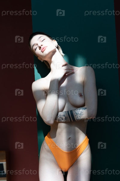 Молодая красивая женщина позирует в оранжевом купальнике в студии