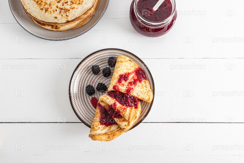 Вид сверху на тарелку со свеженарезанными блинами, блинами с вареньем и ягодами на белом деревянном столе. Копировальное пространство. Вкусный завтрак. десерт