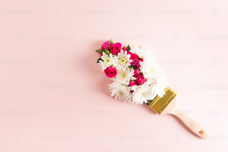 Кисть с разноцветными свежими цветами на пастельном фоне. Копировальное пространство. Творческая композиция. Вид сверху. Концепция весны