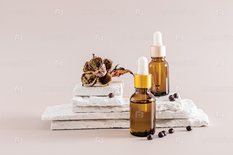 Две стеклянные бутылки с увлажняющей сывороткой, маслом для ухода за кожей лица стоят на кусочках белого кирпича с засушенным цветком. Антивозрастной уход. макет