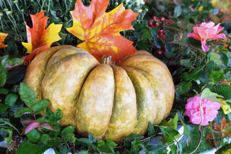 Натуральная тыква и декоративные цветы с листьями