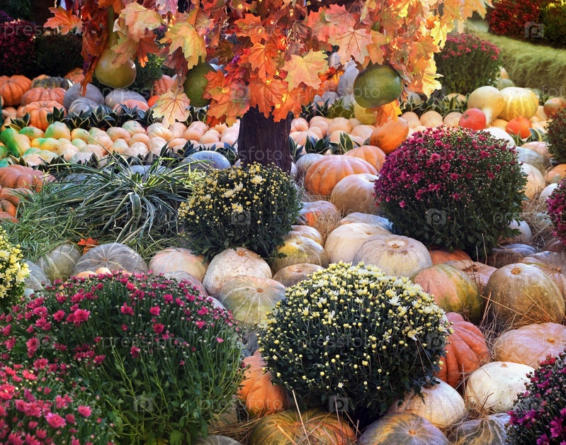 Натуральная тыква, уложенная между цветами. Оформление дня тыквы