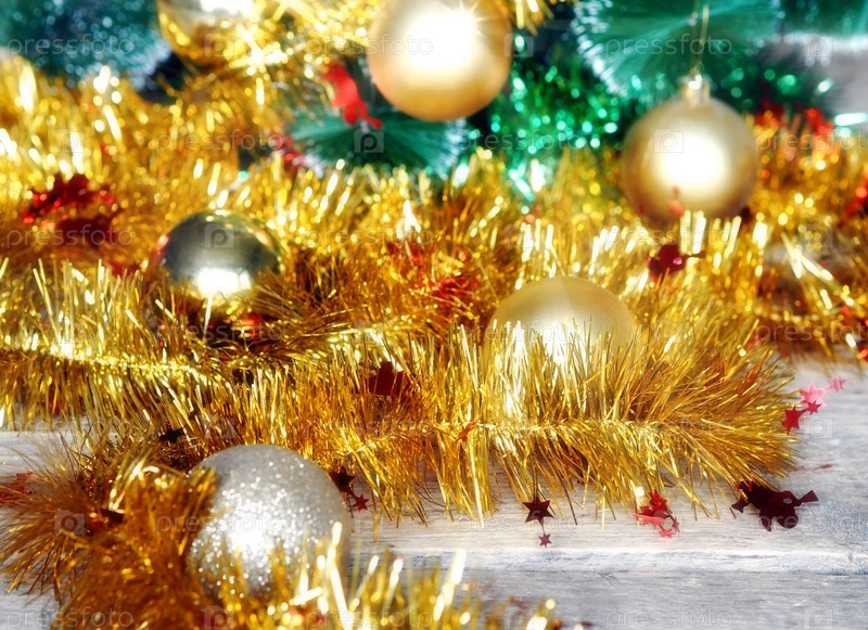 Рождественский фон с желтой мишурой и рождественскими шарами на деревянном столе. Селективный фокус с размытым фоном. Поздравительный минималистичный фон