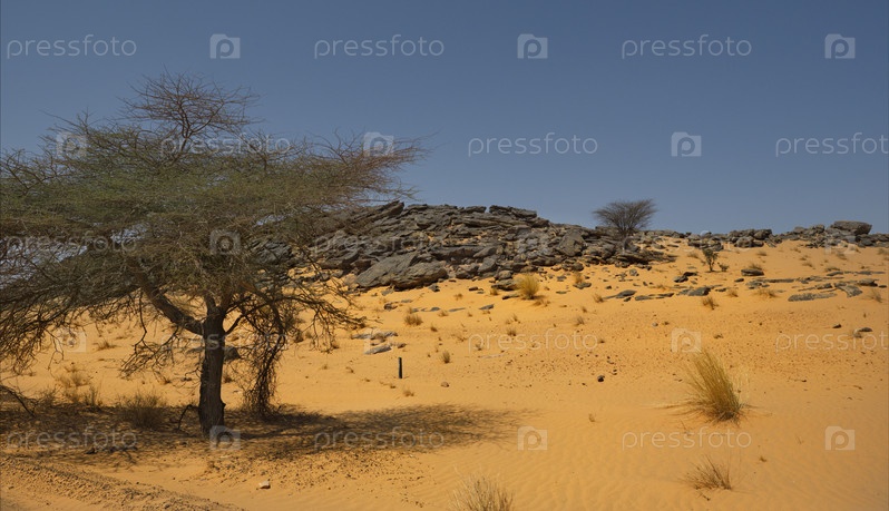 Западная Африка. Мавритания. Панорама бесконечных песчаных дюн пустыни Сахара с одинокими деревьями и кустарниками (акация, саксаул)