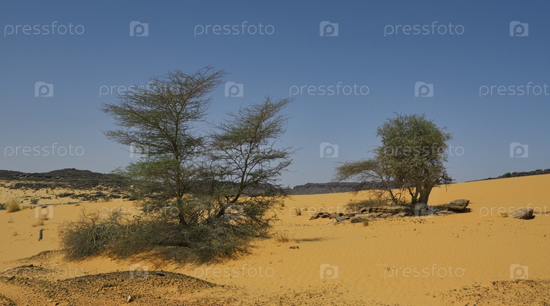 Западная Африка. Мавритания. Панорама бесконечных песчаных дюн пустыни Сахара с одинокими деревьями и кустарниками (акация, саксаул)
