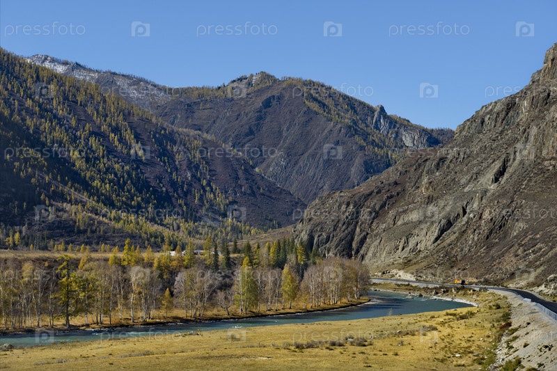 Россия. Горный Алтай. Осенний вид на бирюзовую реку Катунь с Чуйского тракта