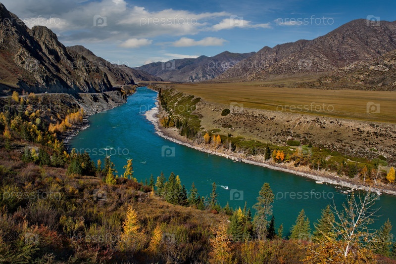 Россия. Горный Алтай. Осенний вид на бирюзовую реку Катунь с Чуйского тракта
