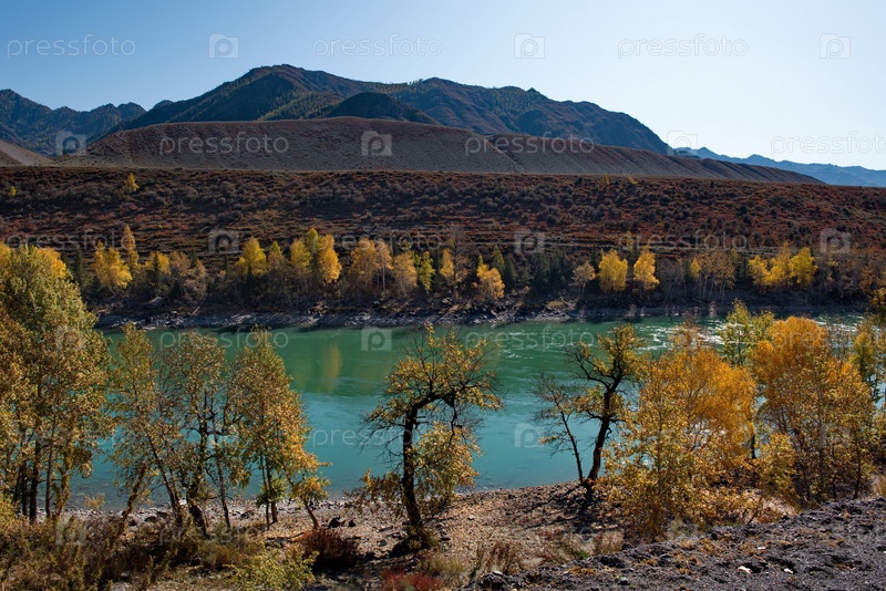 Россия. Горный Алтай. Осенний вид на бирюзовую реку Катунь с Чуйского тракта