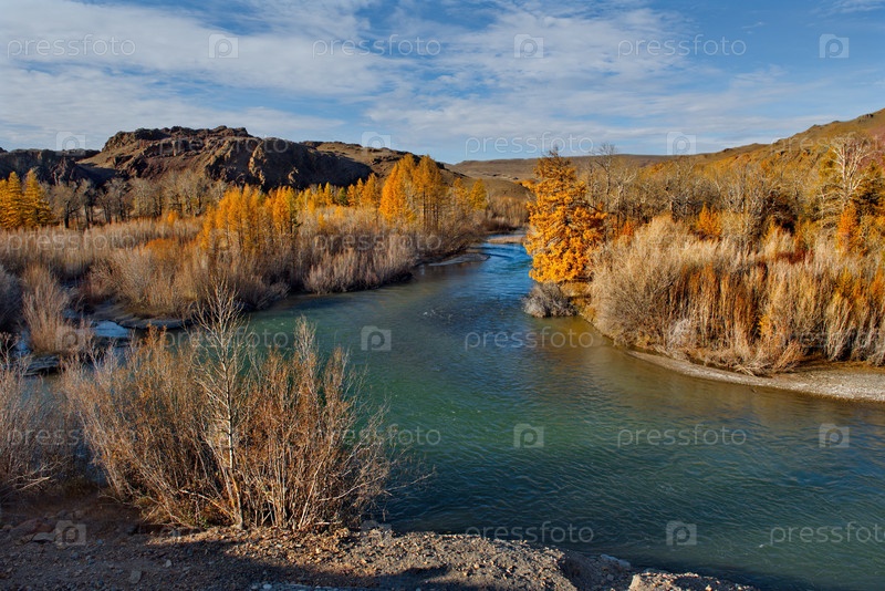 Россия. Горный Алтай. Осенний вид на бирюзовую реку Катунь с Чуйского тракта