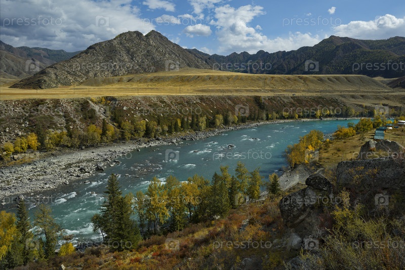Россия. Горный Алтай. Осенний вид на бирюзовую реку Катунь с Чуйского тракта