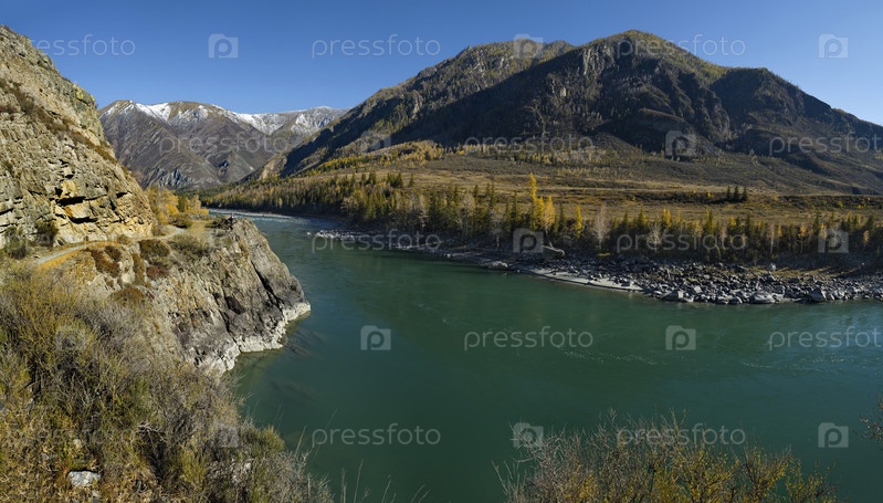 Россия. Горный Алтай. Осенний вид на бирюзовую реку Катунь с Чуйского тракта