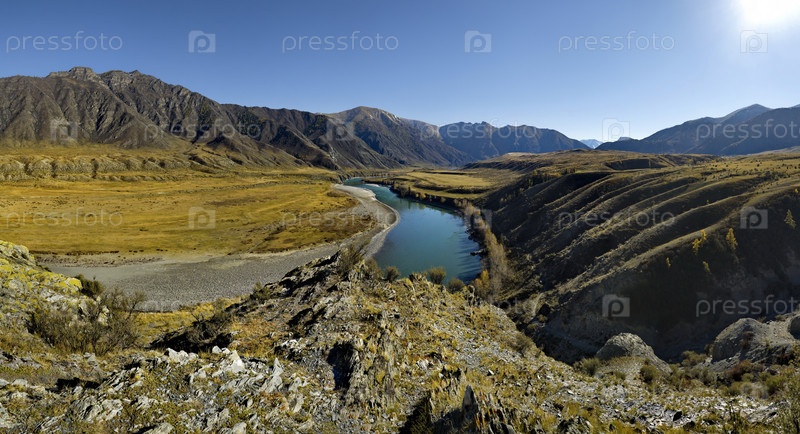 Россия. Горный Алтай. Осенний вид на бирюзовую реку Катунь с Чуйского тракта
