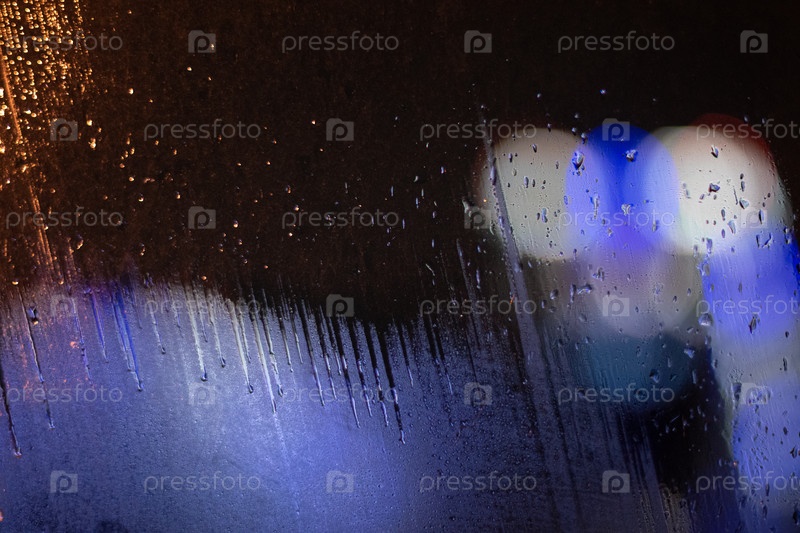 Блики огней ночного города на лобовом стекле автомобиля, боке, расфокусировка